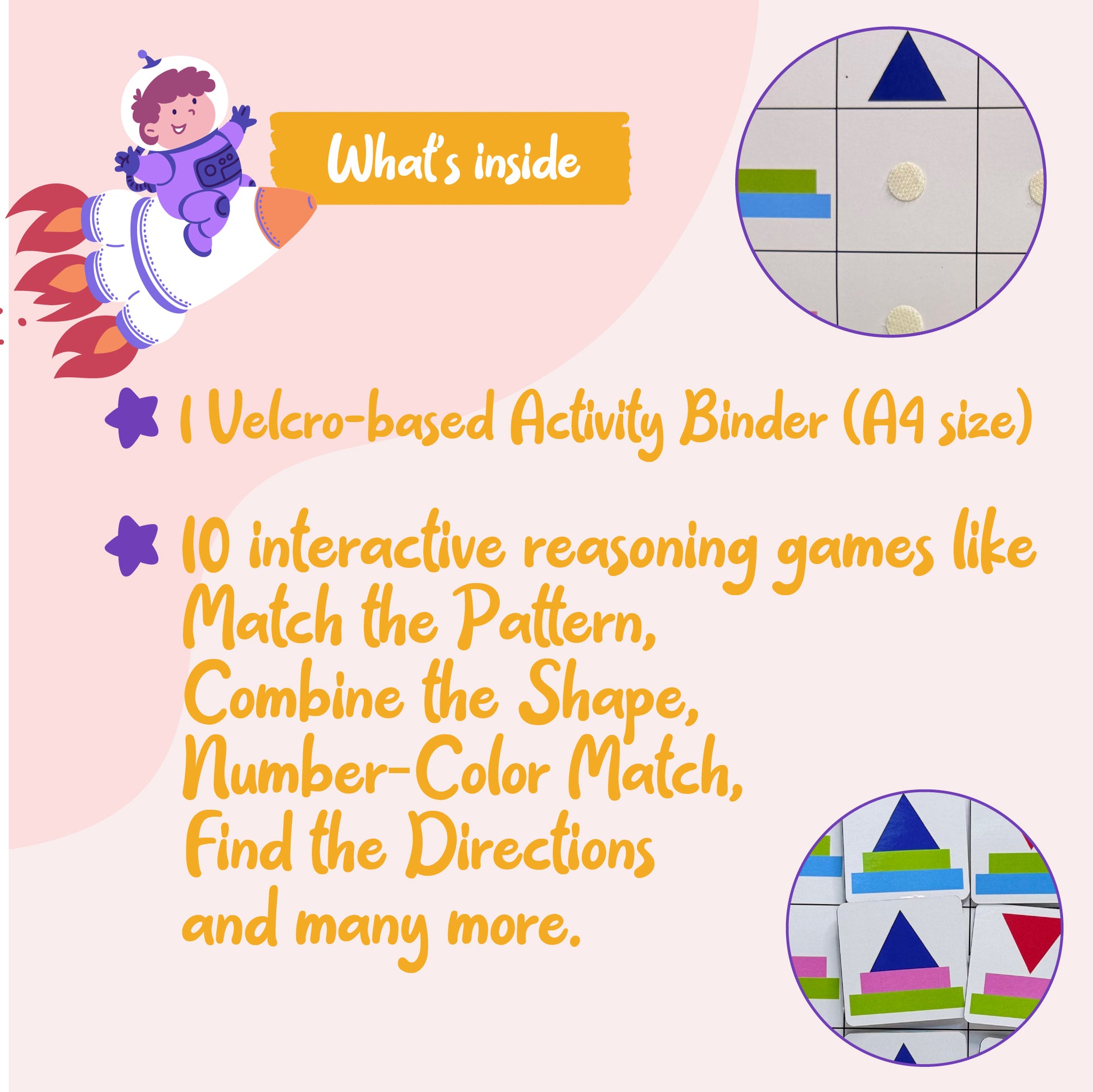 10 interactive reasoning games like Match the Pattern, Combine the Shape, Number–Color Match, and Find the Directions.