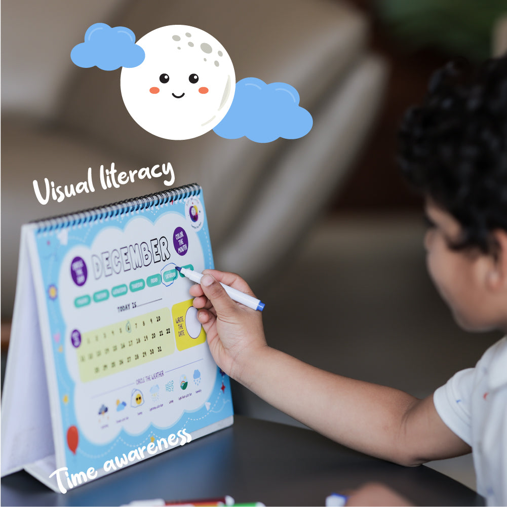 The Interactive Kids Calendar is a tactile learning tool for kids, combining daily date tracking with hands-on engagement. Featuring playful, moveable components for days, months, seasons, and weather, it encourages routine, time awareness, and early organizational skills- making each day a fun, educational discovery.