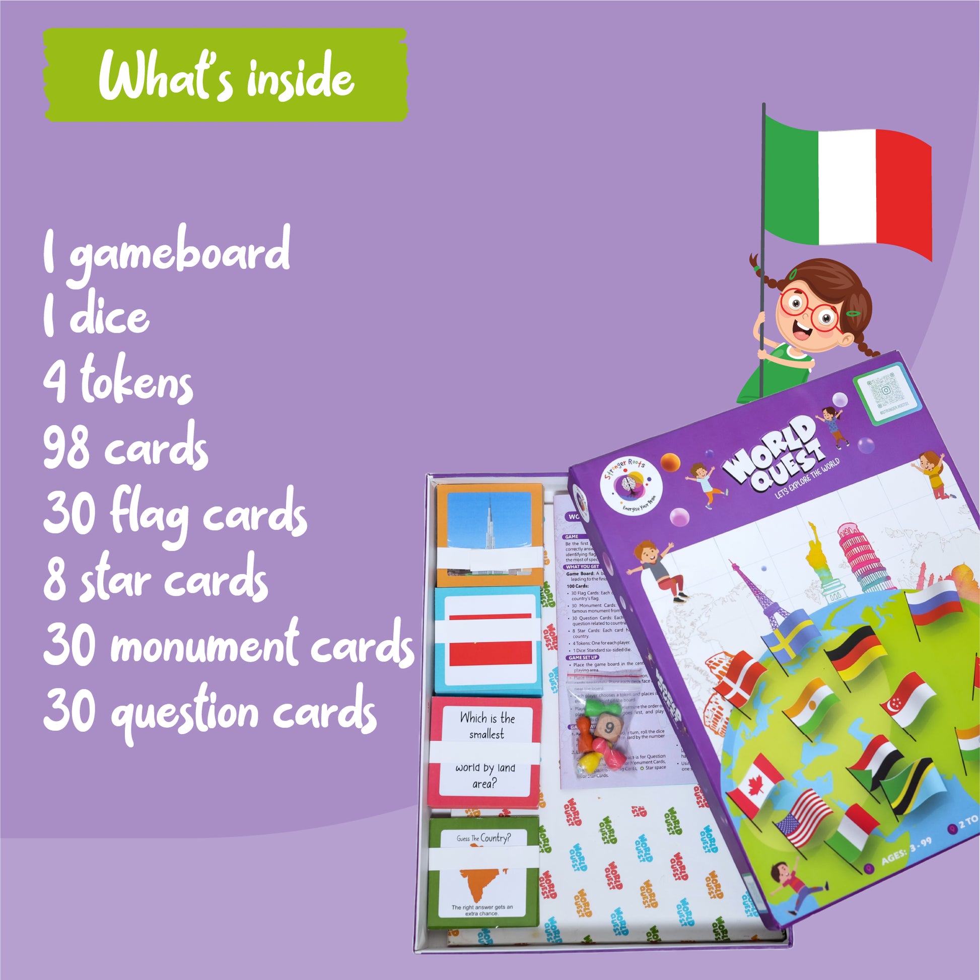World Quest is an engaging educational board game that invites kids to explore world geography, diverse cultures, and iconic landmarks through fun, trivia-style play. Perfect for curious young minds, it combines learning with friendly competition- turning global knowledge into a playful adventure.